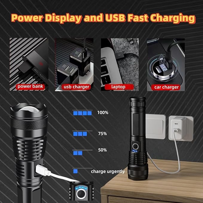 - 4. Power Display and USB Fast Charging: Equipped with four indicator lights, the flashlight shows remaining battery power. All four lights on mean the battery is at 100%/75%/50%/25%. Quick charging Type-C port fully charges the camping flashlight in 3 hours.