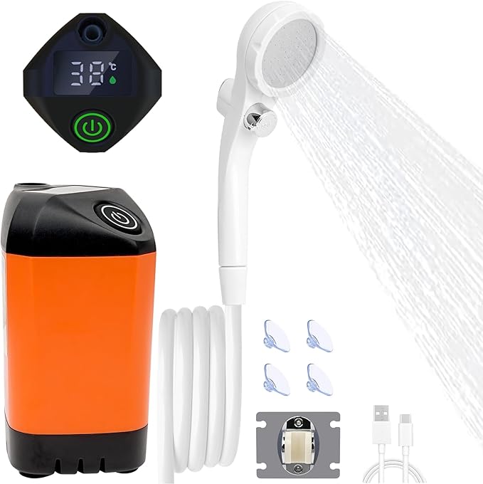 Outdoor Camping Shower, 7800mAh Outdoor Camp Shower Pump, Rechargeable Electric Shower Pump with Intelligent Digital Display, Powered by Rechargeable Battery for Camping, Hiking, Traveling, Orange