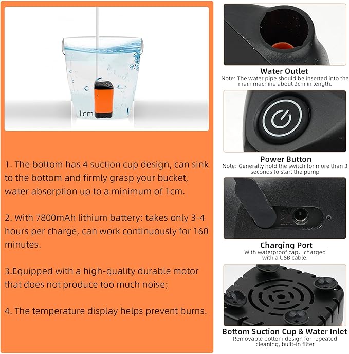 - 3. Upgraded Bottom Design: The upgraded portable shower pump is equipped with a high-quality durable motor that does not produce too much noise; The bottom has 4 suction cup design, can sink to the bottom and firmly grasp your bucket, maximize the water absorption, water absorption up to a minimum of 1cm, keep the body stable, not easy to shake; The bottom of the pump body can be removed, and the built-in filter can be cleaned repeatedly.