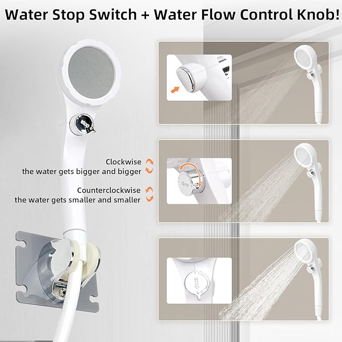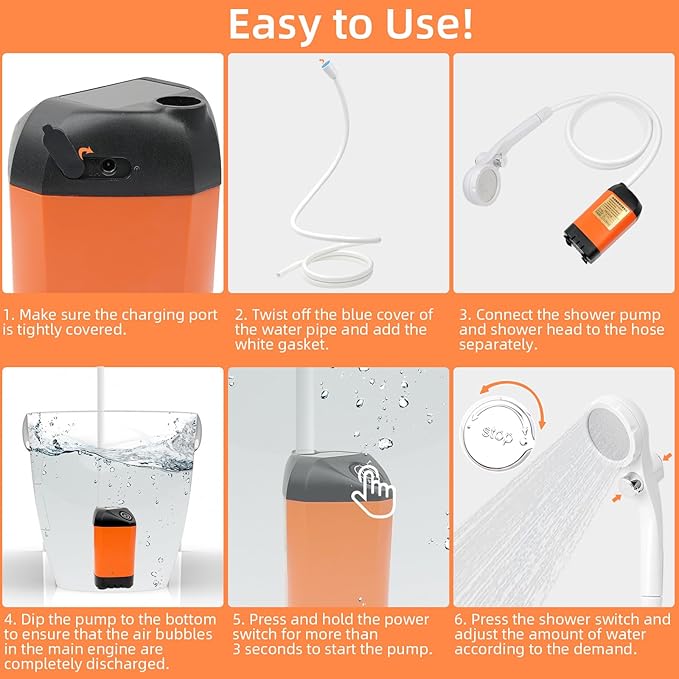 - 4. Easy to Assemble and Operate: The camping shower with pump is very easy to use, just hold down the switch on the battery pack for more than 3 seconds to start the pump; The shower head is equipped with a water stop switch and a knob to adjust the flow so you can easily switch between different modes, it offers a gentle and comfortable flow of 2.11gal/min(8 L/min).