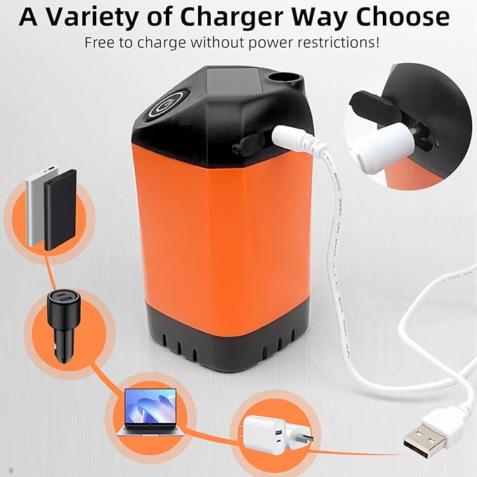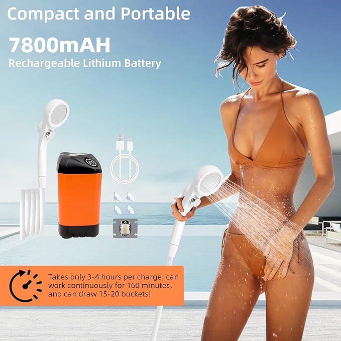 - 1. Upgraded 7800mAh Battery: The portable shower has built-in 7800mAh lithium battery that takes only 3-4 hours per charge, can work continuously for 160 minutes, and can draw 15-20 buckets of water to meet daily needs. Mobile phone charger (5V 0.5-2A), mobile power supply, laptop or car USB output charging, charging interface with waterproof cap, safe use.
