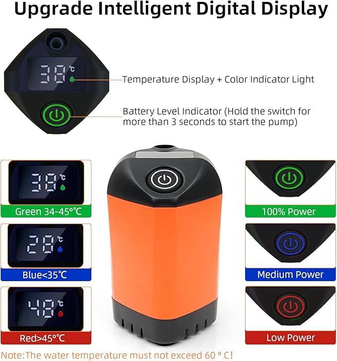 - 2. Upgrade Intelligent Digital Display: Real-time power display is convenient to view the remaining power at any time: green light indicates full power, blue light indicates medium power, red light indicates low power; Real-time water temperature display, the indicator light is green; When the water temperature is lower than 35 ° C /32°F, the indicator light is blue; When the water temperature is higher than 45 ° C /140°F, the indicator is red.