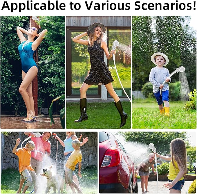 - 5. Compact and Portable: Portable shower for camping is lightweight, compact, and equipped with free mesh storage bag, easy to carry and storage. The package also includes a thickened 2-meter PVC water pipe, shower stand with suction cup, shower head, USB charging cable and English instruction manual.