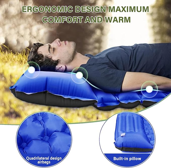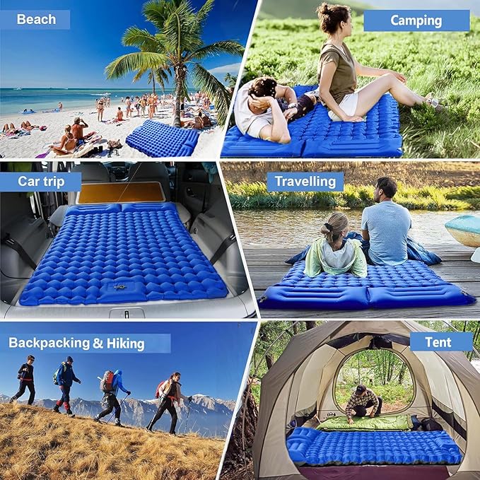 - 【Larger Size to Rest & Quality Warranty】Both sides of the sleeping pad can be used, offering comfortable space for leisure and entertainment, good for couples or family. In order to make more energy to your camping trip, the camping sleeping pads with pillows prevents you from the hard and cold ground while sleeping.