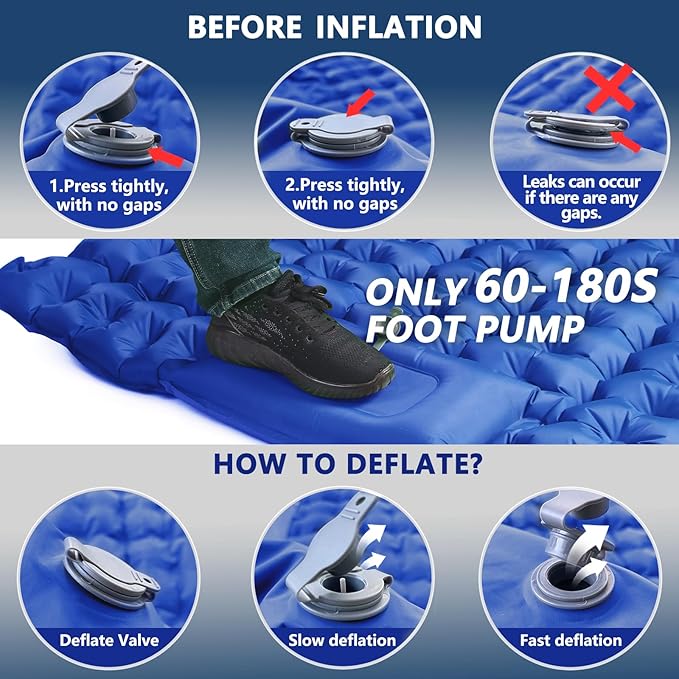- 【Foot Press to Inflate-Only 1-3 mins Needed】There is no need to inflate with your hands, mouth, or a pump for our camping sleeping pad. It just only takes 1-3 mins after you inflate the sleeping mat fully by stamping the spot of the built-in pump with your foot. With anti-leakage films in the valves, you would never worry about air leaking when using it! Besides, super quick to deflate-take out the deflation plug.