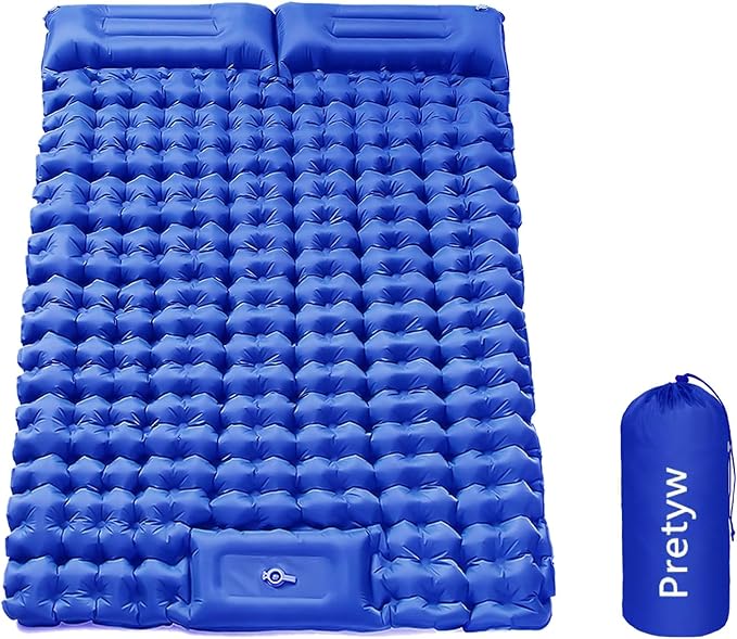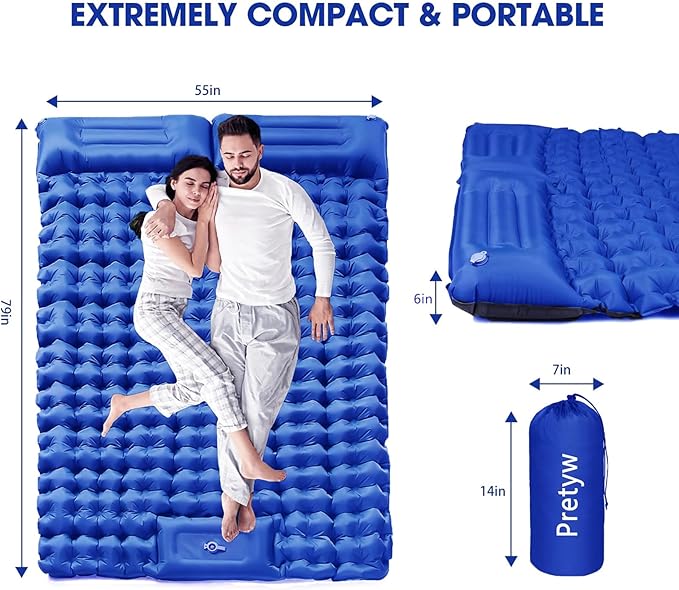 - 【Sleeping Pad for Two Person】Made with the strongest outdoor-grade material, Pretyw double sleeping pad is perfect for any weather conditions. Be able to accompany you on any type of adventure, our double camping mattress pad inflates to an impressive size of 79" X 55" X 4'' and will give you the comfort you need. The sleeping pad is waterproof and only 3.5 lb weight, making it perfect and super easy to carry for any outdoor activities.