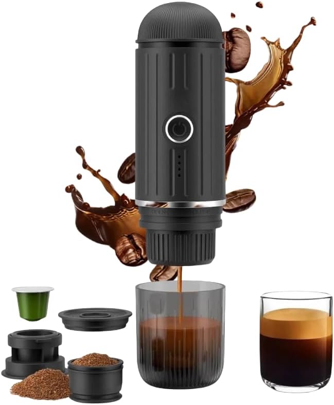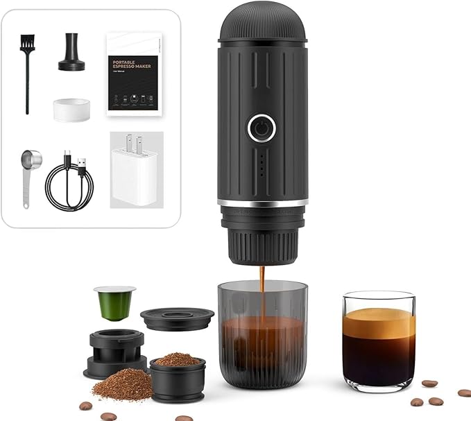 Portable Espresso Machine with 3-4 Min Self-heating, 12V Rechargeable Electric Coffee Machine 19 Bar Compatible with NS Capsules and Ground Coffee for Car Camping Travelling