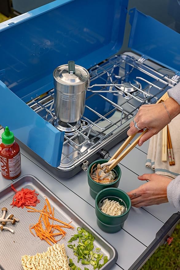 - DURABLE CONSTRUCTION: Built tough for a camp cooking set, these camping must-haves cookset accessories feature 18/8 stainless steel that resists dents and breaks. The double-wall insulated cups keep drinks hot, while the exterior stays cool to touch.