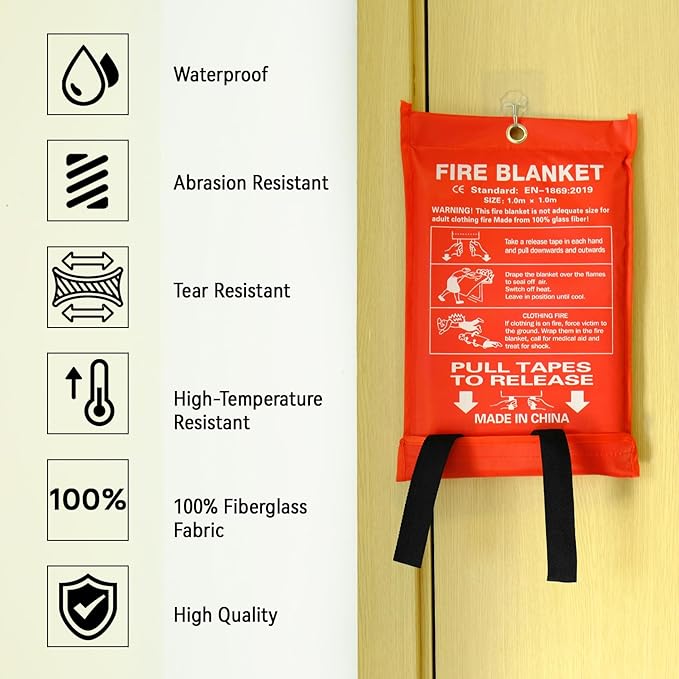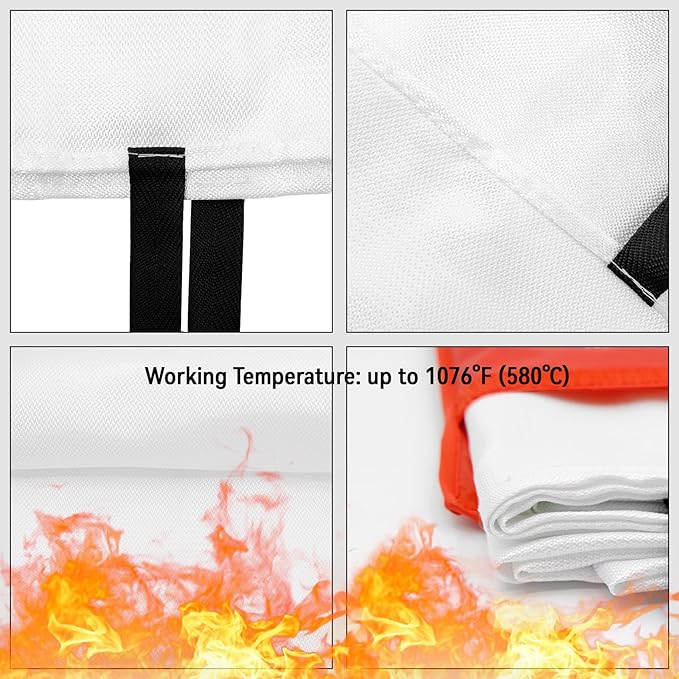 - 【Premium Products】: Emergency fire blanket for home and kitchen, made of 100% flame-resistant fiberglass fabric, compliant with the latest EN-1869:2019 standards, it can shielding oxygen away from burning embers, promptly and efficiently extinguishing the fire, capable of isolating temperatures up to 1076°F (580℃)