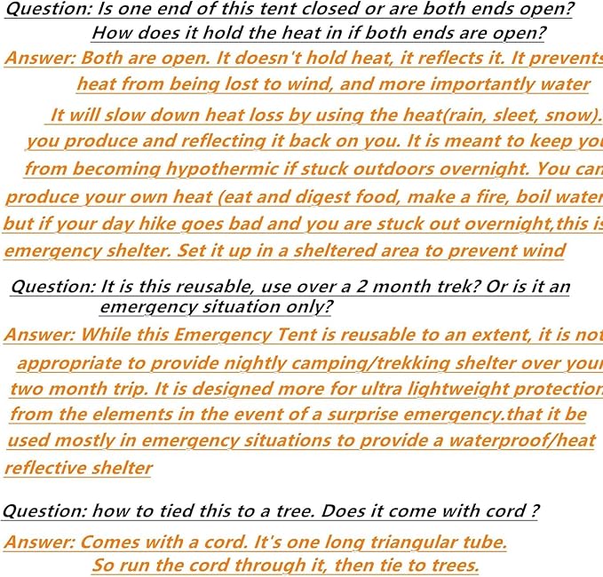 - 【Multi Purpose】Can be used as a hiking tent,emergency signal,emergency shelter,ground covering,wind preventer,water collector,snow melt container,floor cloths,disaster signals,backpack covers,ponchos,sleeping bag liners,horseshoe backpacks,windshields,shade sails,solar cookers,rain collectors,snow melters,floating,ropes,fishing lures,bird repellents,cleats,slings,bandages,off-road markers,bear bags,etc.