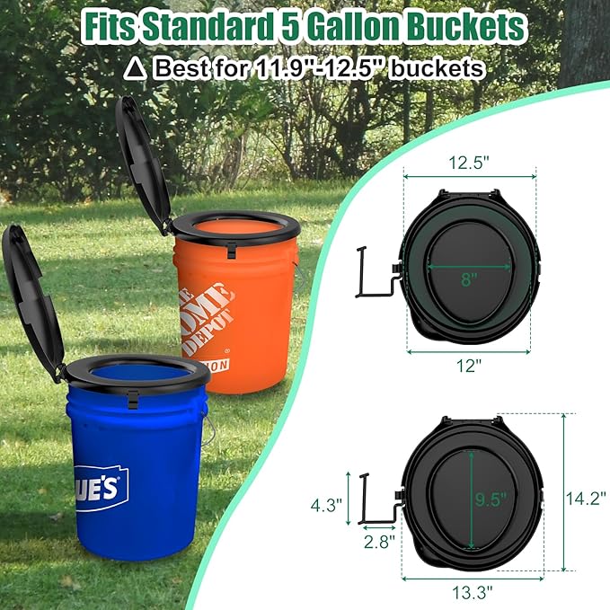 - 【Universal Fit】Effortlessly convert your 5 gal bucket into a portable toilet or a convenient stool with the PAHTTO toilet seat. Widely compatible for standard 5 gallon/ 19 litter buckets with diameter 11.9-12.5 inch. Specifically tailored to fit Home Depot and Lowe’s 5-gallon buckets.
