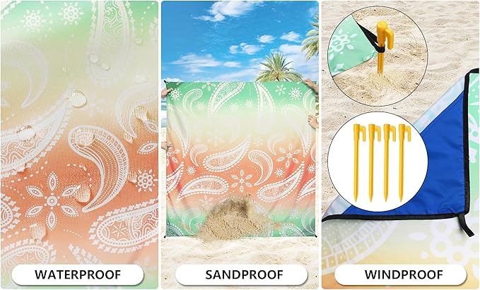- 🌴【Beach Accessories】1 * beach blanket waterproof sandproof; 4 * Durable ABS Anchor Stakes; 1 * Carabiner; 1 * Carry Bag
