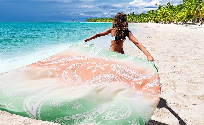 - 🌴【Lightweight Beach Items】79"*83" beach blanket oversized, weighted 0.71 lbs, fit 1-3 adults, and they can be easily folded into a 5.1"×7.5" carry bag.