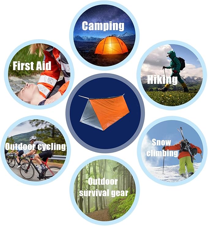 - 【Multi Purpose】Can be used as a hiking tent,emergency signal,emergency shelter,ground covering,wind preventer,water collector,snow melt container,floor cloths,disaster signals,backpack covers,ponchos,sleeping bag liners,horseshoe backpacks,windshields,shade sails,solar cookers,rain collectors,snow melters,floating,ropes,fishing lures,bird repellents,cleats,slings,bandages,off-road markers,bear bags,etc.