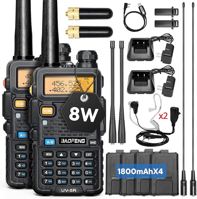 BAOFENG UV-5R Ham Radios Long Range—8W Dual Band Rechargeable Walkie Talkie Portable Two-Way Radios, UV5R Handheld Radio with Four 1800mAh Li-ion Batteries (2 Pack)