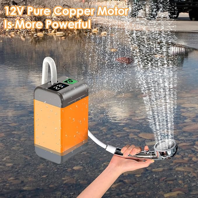 - 【12VF Strong Power】This handheld outdoor electric shower uses a 12VF enlarged pure copper motor, which increases pressure, has a larger water output, and a better experience! At the same time, it has three adjustable water output levels: large, medium, and small.