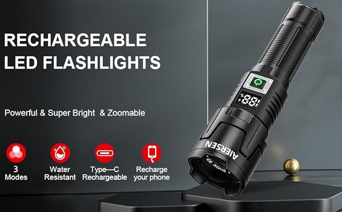- Rechargeable flashlight with digital display: rechargeable flashlight with USB-C interface, can achieve 4 hours fast charging, USB output can be used as emergency power charger, for mobile phones, laptops, cameras charge, is a good helper when you camp or emergency use.