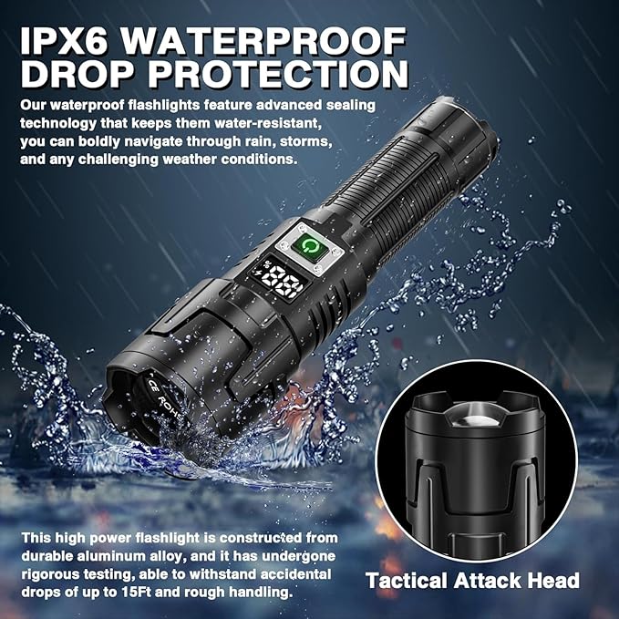 - HIGH STRENGTH IPX6 WATERPROOF RATING: The torch is made of aircraft-grade aluminium alloy, which is shatterproof and break-proof, so you don't have to worry about dropping the torch. This high power LED torch has been strictly tested by us . IPX6 waterproof, it can be wet by rain, ice, and still can be ignited normally.