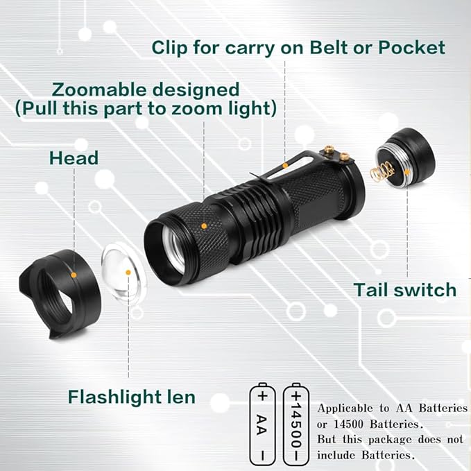 - The flashlight is powered by 1AA battery or other rechargeable battery as AA battery Size but the max Voltage is 4V. (battery is not included in the package)