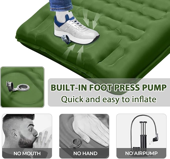 - 🍀 Fast Inflation Camping Pad: Including an innovative built-in foot pump- Just pedal 30-60s to fully inflate the camping mat & 1s deflate.The air mattress with built-in foot pump with the upgraded version of the air release valve with no leaking film, you shall never worry about air leaking!