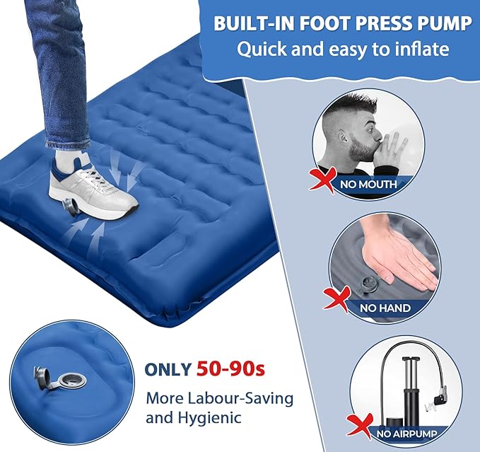 - ⛺Fast Inflation Camping Pad: It's time to say goodbye to the hassle of inflating by mouth or carrying a bulky air pump. You can easily inflate it in about 50-90s & 1s deflate.The Oversized air mattress hiking with built-in foot pump suitable for outdoor and indoor activities such as camping, car travel, mountain climbing,and so on.