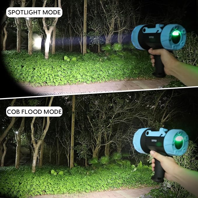 - RECHARGEABLE BATTEREIS & POWER BANK : The spot lights outdoor handheld Built in a 10,000mAh batteries. Complete quick charging in 4hours with a 2A adapter (NOT included in the package) and the included USB cable. Universal USC charging port can even be used as a power bank to charge other devices.