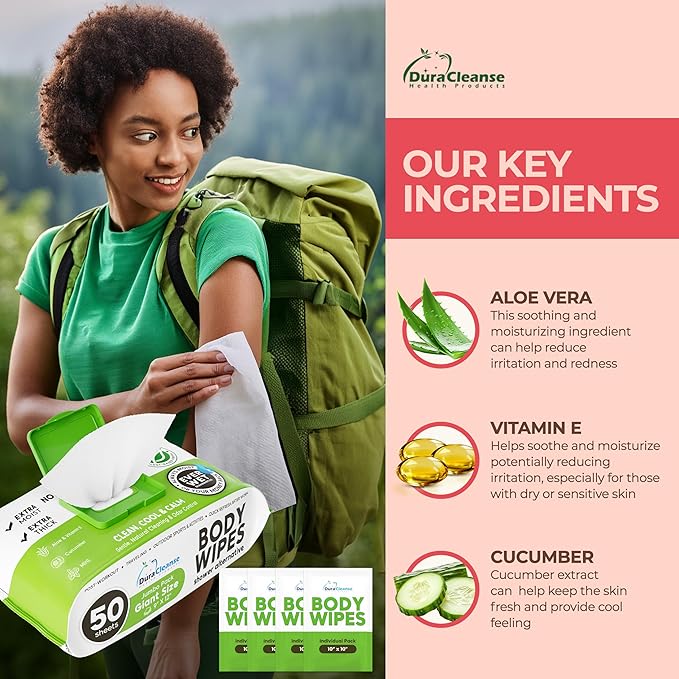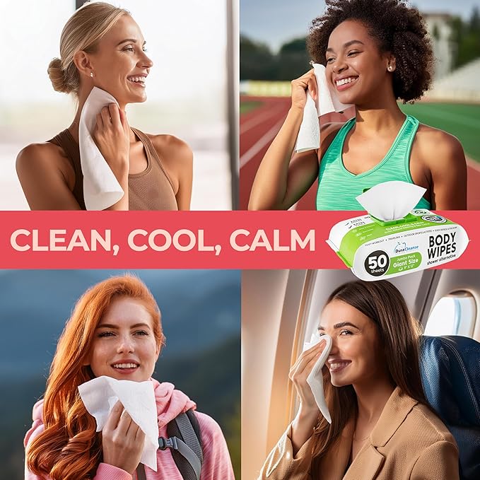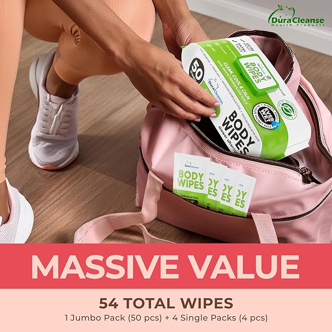 - Travel-Friendly Pack: Packaging for personal wipes women has a tight resealable closure that retains moisture. Its simple cover allows quick access to the body wipes for women while on the go. You get 50 large wipes with free 4 individually packed travel items for women and body wipes for women . Tailgating, music festival, beach, glamping & camping essentials, RV camper van must haves, travel toiletries for women, incontinence wipes, shower alternative adult wet wipes, gym wipes for women.
