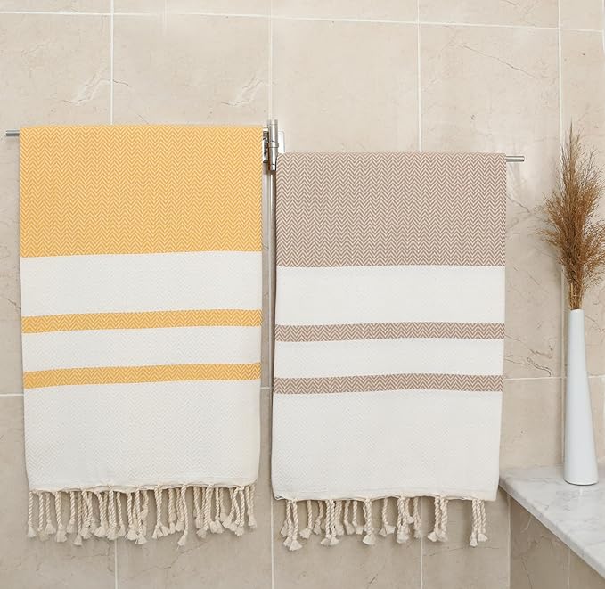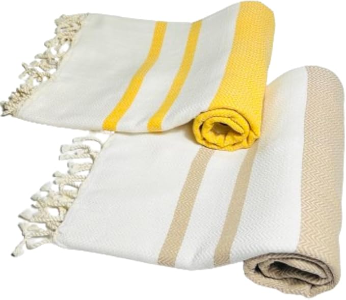 2 Pack Cotton Oversized Beach Towel Turkish Peshtemal Quick Dry Absorbent Lightweight Washable Sand Free Blanket Summer Camp Swim Pool Travel Compact (Caramel Beige and Gold Yellow)