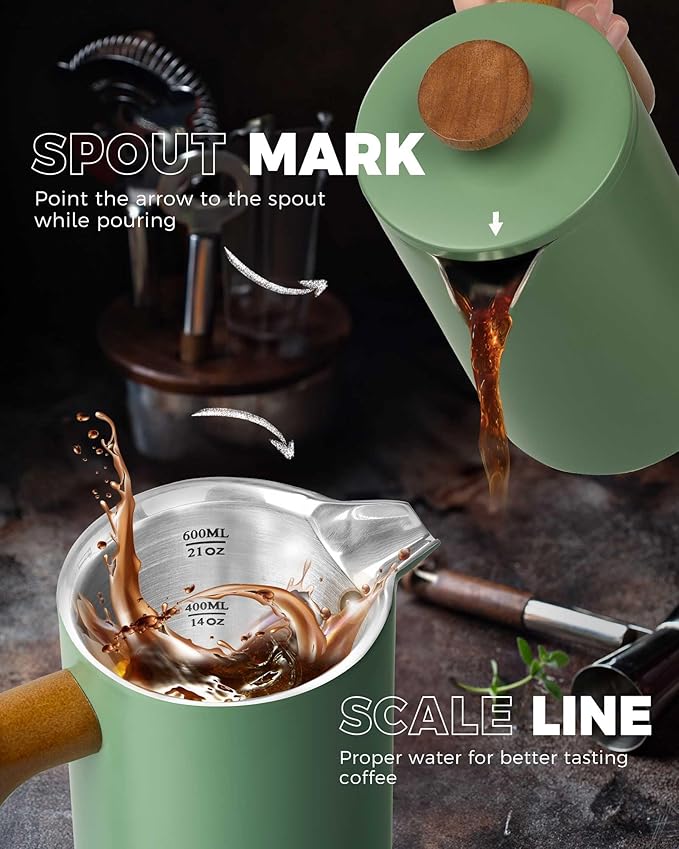- KITCHEN GRADE STAINLESS STEEL MATERIAL: Crafted from high-quality stainless steel,the French Press is not only aesthetically pleasing with its sleek finish but also durable enough for both indoor and outdoor use. The 21 ounce capacity is suitable for different scenarios such as breakfast, working or camping.