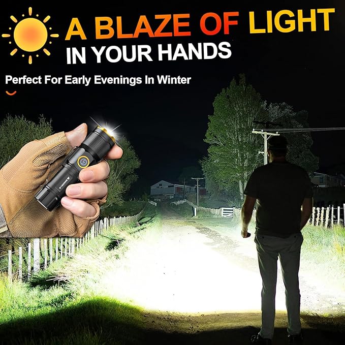 - 【Waterproof for Multiple Uses】Brave the elements with IPX6-rated waterproof flashlight, designed to withstand rain and snow. Its textured grip ensures it stays in hand, making it an indispensable tool for outdoor adventures and critical situations alike. Not only widely used for daily lighting, power outages, emergencies, but also a good buddy for outdoor sports such as dog walking, camping, etc.