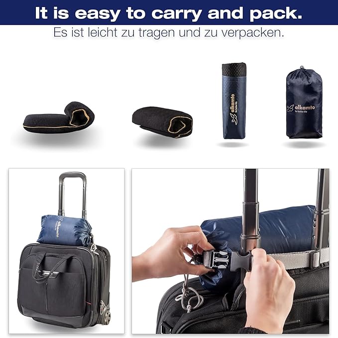 - ✔ LIGHT & EASY TO PACK - Easy to carry pillow around for all kinds of trips (like camping / fishing / backpacking / hiking / beach / festival) its lightweight design and travel case. Compressible and self-inflatable, easily be fitted inside its compact and small travel bag and rises up to its full shape once taken out in a matter of seconds. Ideal to take on airplanes, trains and cars or for outdoor activities along other camping gear, hiking and travelling accessories.
