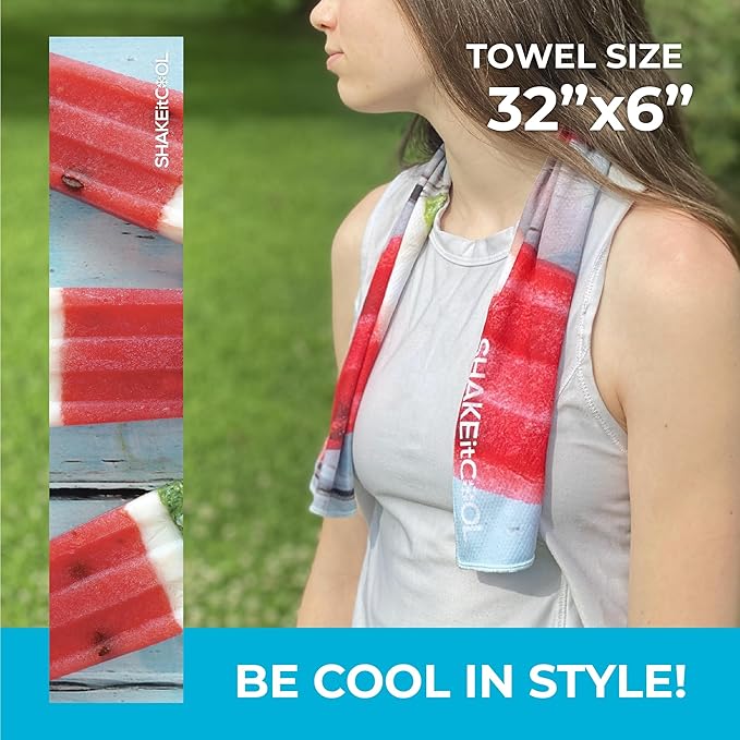SHAKEitCOOL Original Cooling Towel – Be Cool in Style - Heat Relief, Soft, Lightweight, Sun Protection, Easy Clean - Perfect for Biking, Running, Yoga, Gym, Gardening - Watermelon