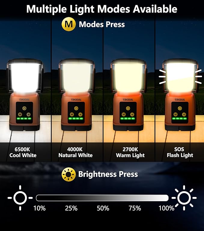 - 【Bright Camping Lights & Lanterns】CRODIAL camping lantern is equipped with 53 SMD LED bulbs, providing an impressive reliable light brightness. Built-in 5000mAh rechargeable battery ensures a long and consistent output of brightness, also can be used as battery lanterns to charge for smart devices