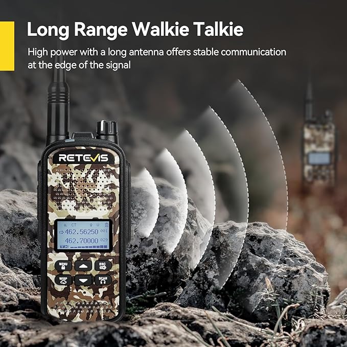 - Hunting walkie talkies long range; 5W high power walkie talkie with a long antenna and 8 relay channels; extends the communication distance effectively; users won't worry about communication problems outdoors
