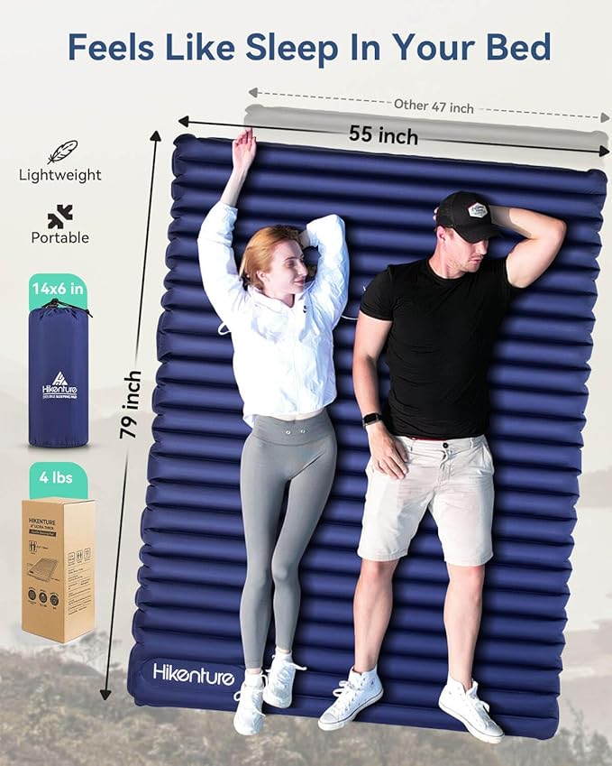 - Never Touch The Hard Ground: With 4 inches thickness, Hikenture camping mattress for 2 person offers a cozy and solid cushion and padding for side sleepers, back sleepers, or stomach sleepers, delivering bed-like comfort during your journey. The inflatable sleeping pad also provides ample space for you to turn over at will.