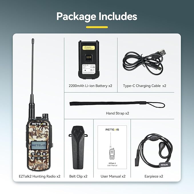 - Included Components : 2 x Belt Clip, 2 x EZTalk 2 Two Way Radio, 2 x 2200mAh Li-ion Battery, 2x User Manual, 2 x Headset, 2 x Type-C Charging Cable & Charger 2 x Belt Clip, 2 x EZTalk 2 Two Way Radio, 2 x 2200mAh Li-ion Battery, 2x User Manual, 2 x Headset, 2 x Type-C Charging Cable & Charger