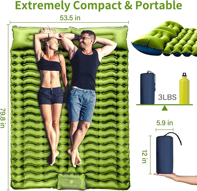 Double Sleeping Pad - Self Inflating 4" Extra-Thick for 2 Person with Pillow Built-in Foot Pump Inflatable Sleeping Mat for Backpacking, Hiking, Traveling, Tent, Portable Camping Mat