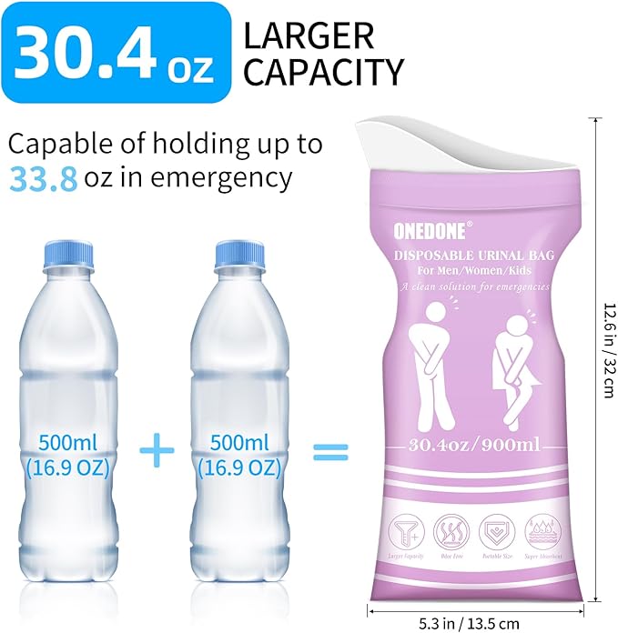 - LARGER CAPACITY & LEAKPROOF DESIGN- The emergency urine bag boasts a generous 30.4 oz/ 900ml capacity, making it ideal for men, women and kids during emergencies. The disposable urinal bag for men comes with a good sealing proformance sealing strip to prevent leaks. Remember to seal it after use