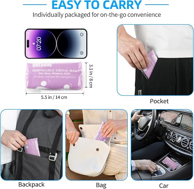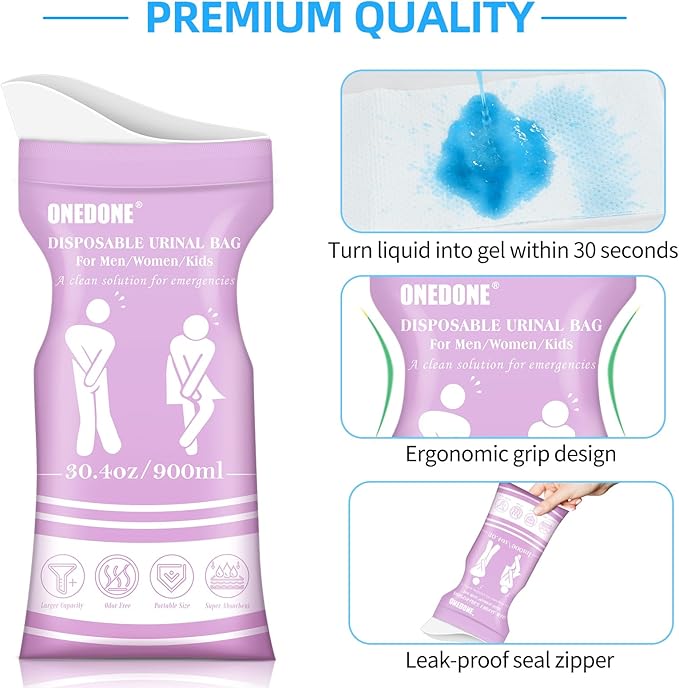 - VERSATILE EMERGENCY URINE BAGS- From outdoor adventures to unexpected emergency situations, ONEDONE disposable urine bag is your go-to solution for relieving yourself during outdoor activities like hiking, fishing, camping, biking, road trips and travel. The pee bags for travel also can be used as vomiting bags/ barf bags for motion sickness during long-distance road trips