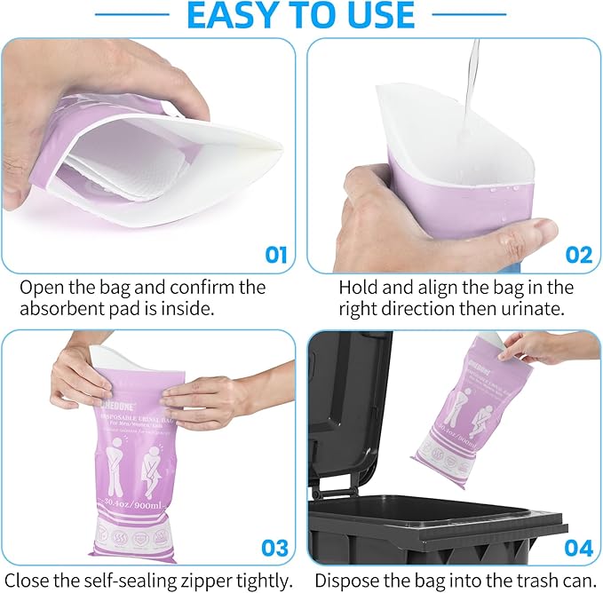 - EASY TO USE-Open the travel pee bag and confirm the absorbent pad is inside, which turns liquid into gel within 30 seconds. After use, simply seal the bag and dispose of it in the trash can.No need to open or empty it, making it both eco-friendly and hassle-free