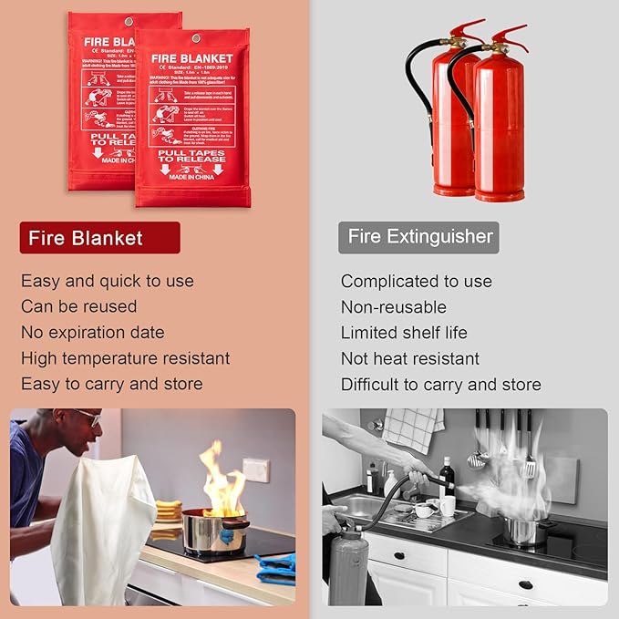 - Safety and Security: The fire blanket is made of two layers of woven fiberglass and an internal flame retardant membrane, which meets CE safety standards (new EN 1869:2019) and can withstand temperatures up to 1076°F (580°C), making it a reliable safety measure when extinguishing fires.