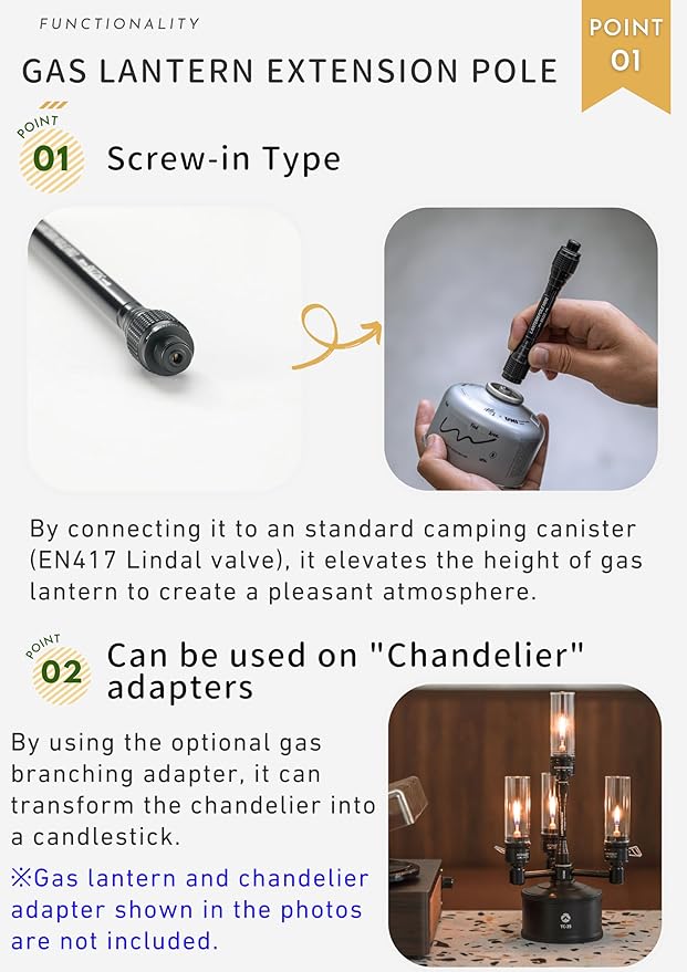 - 【Screw-in Type】By connecting it to an standard camping canister (EN417 Lindal valve), it elevates the height of gas lantern to create a pleasant atmosphere. Inlet : EN417 Lindal Valve (female thread); Outlet : EN417 Lindal Valve (male thread)