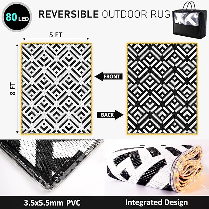 Outdoor Rug 5x8Ft, Solar Powered Outdoor Camping Rug with 80LEDs Strip Lights, Waterproof Plastic Reversible Outdoor Straw Rug Mat for RV Camping Patio Beach Balcony House Deck Picnic
