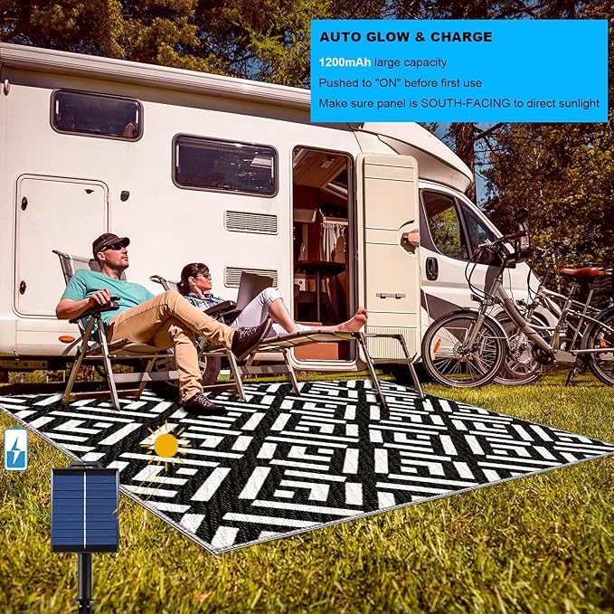 - Use It Anywhere: With the carrying bag, this camping rug is easy to transport and store, so you can take it with you on picnics, beach, and RV trips to enjoy a relaxing time outdoors. You can also use the outdoor carpet for RV travel, picnic, beaches, house deck and pool deck. Modern, versatile and sleek geometric design offers color and personality to your indoor outdoor space. LED strip lights illuminate dankness.