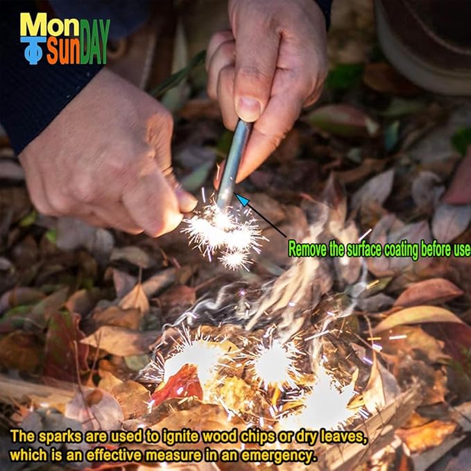 - 🔥The main functional part is the magnesium rod, which is composed of 6 metals with magnesium as the main component, and our unique formula ensures that it has the right hardness, which makes it easier to generate metal chips and thus generate enough sparks.