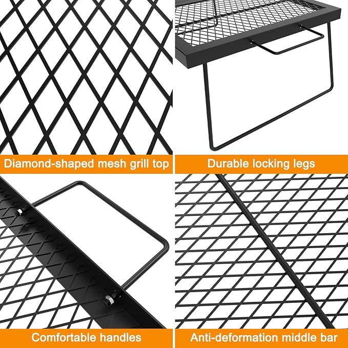- 🔥 High-Density Diamond-Shaped Grill Mesh: Featuring a high-density diamond-shaped grill mesh, this campfire cooking grate ensures uniform heat distribution for perfectly cooked meals every time. Upgrade your outdoor cooking setup with this essential camping accessory for outside adventures.