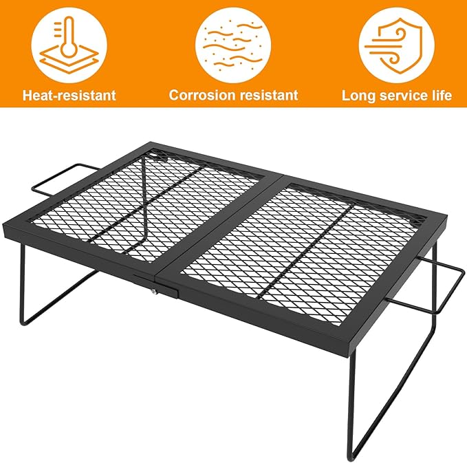 - 🔥Sturdy Solid Iron Stand: Crafted from durable solid iron, our campfire grill grate is built to last, providing a strong and stable platform for all your outdoor cooking adventures. ✅Dimensions: Unfold size: 23.6"L x 15.7"W x10.23"H; Folded size: 15.7" x 11.8" x 2"