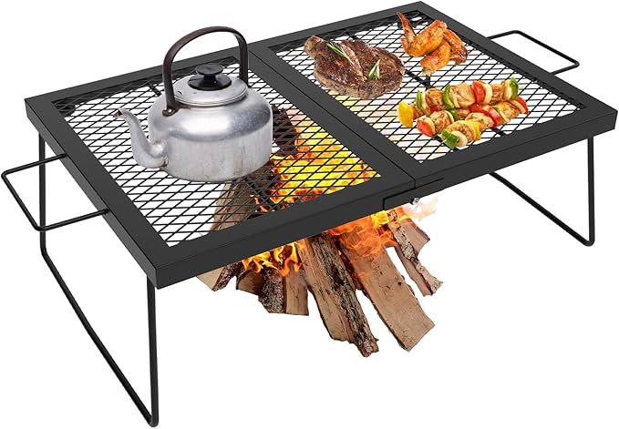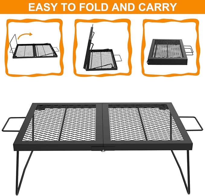 - 🔥Foldable for Easy Portability: Conveniently designed, the legs of this campfire grill grate can be easily folded down and the camp fire grate can be folded in half from the center, making it compact and lightweight for easy transportation to your favorite outdoor cooking spot.