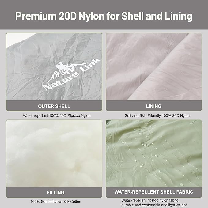 - DURABLE NYLON SHELL AND LINING: This sleeping bag is made of 20D ripstop nylon for shell which is water-repellent, and 20D soft nylon for lining, which is comfortable and skin-friendly, provide you with a warm relaxing sleep.