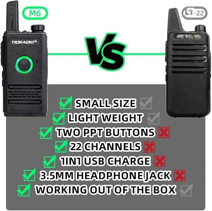 - Out of box : Working straight out of the box with each long range walkie talkies without complicated buttons;The walkie talkies has 22 channels;FCC ID : 2AWL3-TDM6 M6 has obtained FCC certification and can be used without a license.